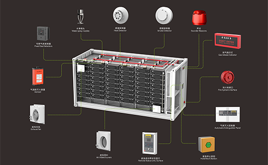 消防方案:消防系統采用儲能電站用火災報警控制裝置。電池倉內設置復合探測器,電氣倉內設置感溫探測器和感煙探測器、警鈴;在防護區出口外上方設置放氣指示燈、聲光報警器;在防護區出口外設置緊急啟停按鈕。在防護區內設置柜式七氟丙烷氣體滅火裝置,包括滅火劑儲存容器、容器閥、滅火藥劑、電磁鐵啟動裝置、噴嘴、壓力顯示器、壓力信號反饋裝置等組成。